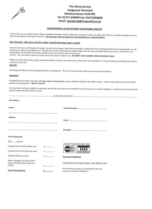 Payment: Complete the form below and send, with your scissors and payment, using a padded envelope to the address above. Please make cheques and postal orders payable to the proprietor: “MR M V DOYLEâ€.